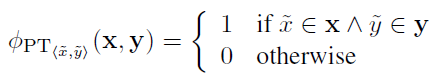 2. 短语表特征(PT, phrase table):词组和词组的对应关系。鼓励按短语表翻译。