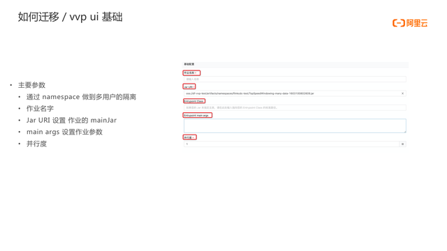 如下图的线下命令如何迁移到线上。首先打开 VVP UI,添加基础配置,主要包括:作业名称、Jar URI、一些主要参数和并行度。还可以点击高级配置,配置更多信息。