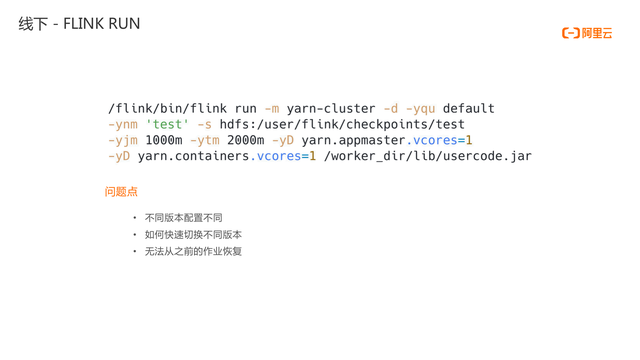 通常用户在线下主要使用 Flink run,这会造成一些问题,比如:同一个配置因版本而变化;无法快速切换不同版本;无法从之前的作业恢复。