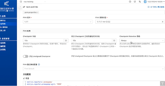 上面介绍的是 Flink 配置中比较重要的部分,下面图片显示的是另外一部分可以设置Checkpoint间隔等的配置,接下来是资源配置。日志配置部分可以选择日志保存位置,方便日后如果作业出现问题,可以方便的排查问题。
