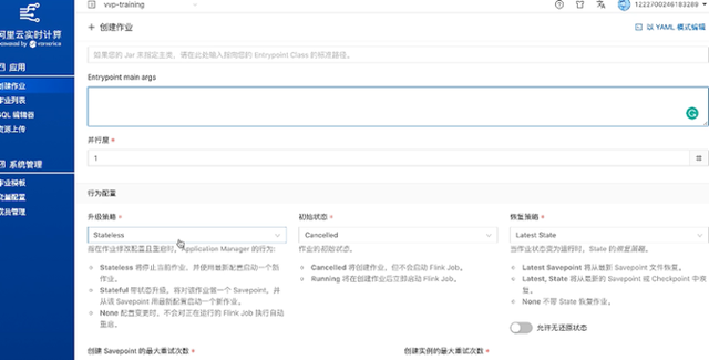升级策略选择Stateless,表示针对已经在运行的作业,编辑并保存配置后,会直接把原作业停掉,然后重新启动一个更新的作业;选择Stateble,针对正在运行的作业做配置编辑并保存的话,作业会先做一次Savepoint,然后加载新的配置并使用该 Savepoint启动新的作业。
