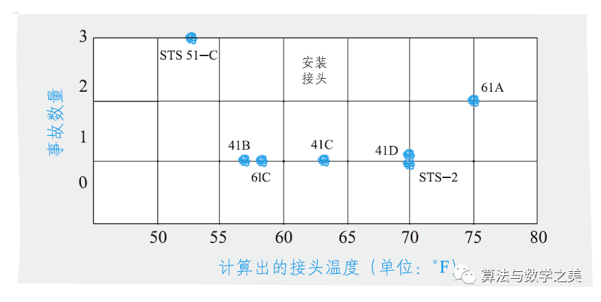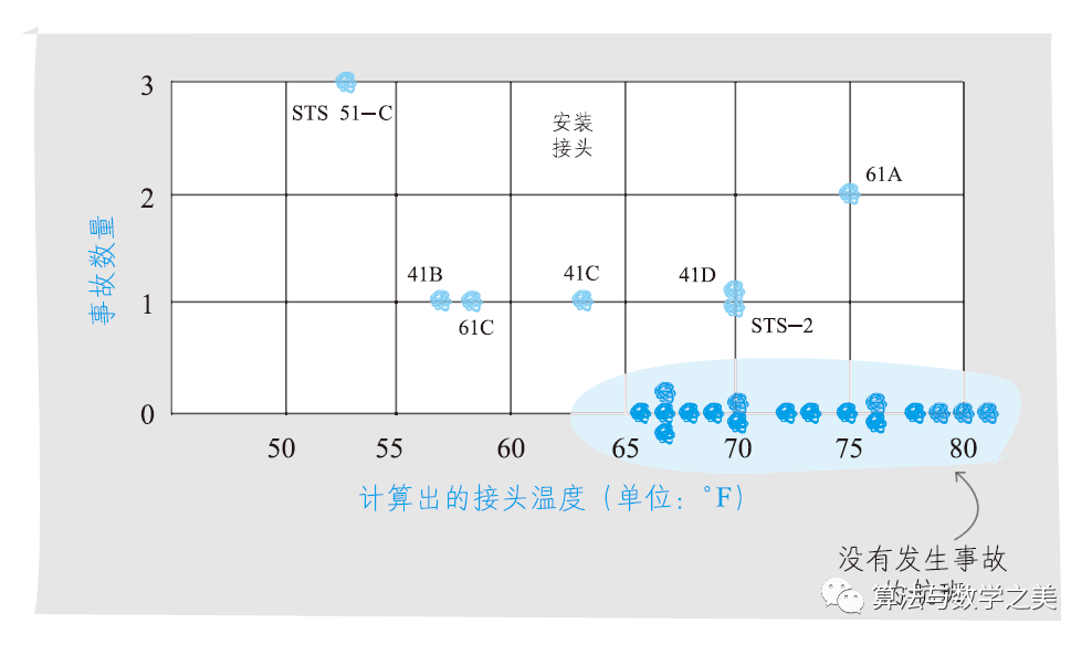 当时的工程师之所以难以进行分析,是因为他们之前掌握的飞行数据是发射时的温度在53华氏度至81华氏度之间,而挑战者号将在异常寒冷的31华氏度条件下发射。他们研究了O形环损坏时的温度,注意到发生在53华氏度至75华氏度之间的O形环热损伤程度。他们确实研究了低于这个温度范围的有限数据,但无法看到清晰的模式(参见图1)。工程师团队在发射前向美国国家航空航天局(NASA)报告了这一结论,提出了他们的担忧,即低发射温度可能影响O形环的性能。