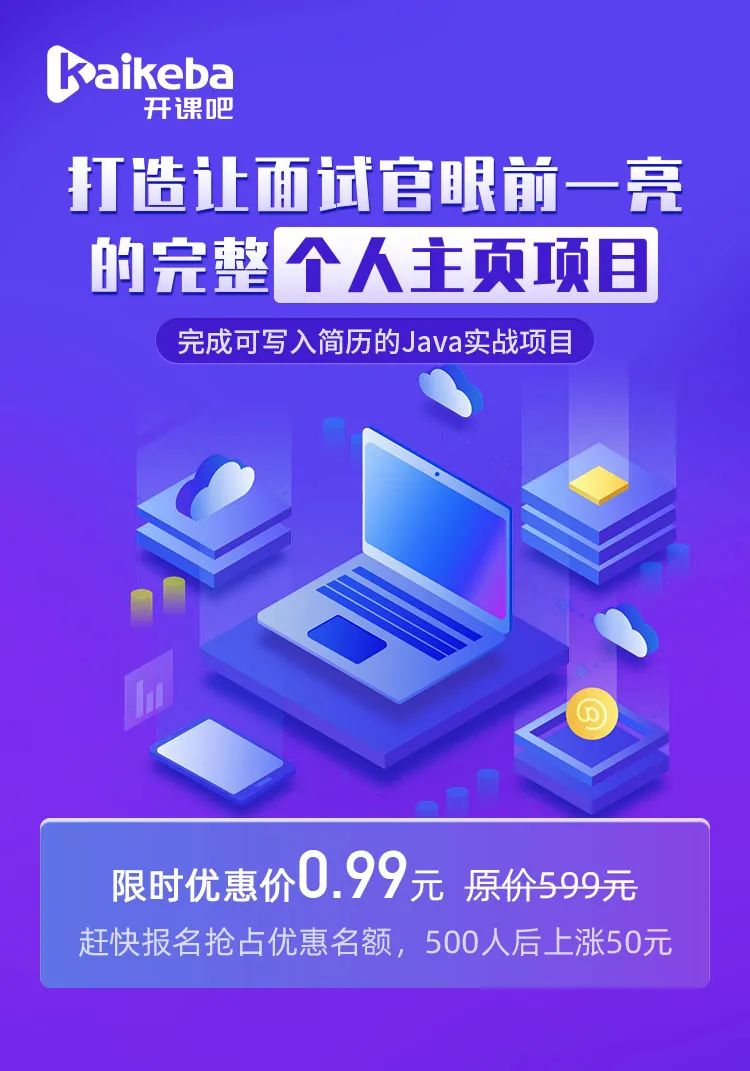 由开课吧Java高级开发工程师打造,三天,让你完成一个让面试官眼前一亮的完整的个人主页项目,这是一个可以让你,写入简历的Java实战项目。内容涵盖的核心技术都是当前十分热门的技术,并且项目流程完整,构建一个场景式学习体验中心,让你完全掌握Java技术的核心难点。