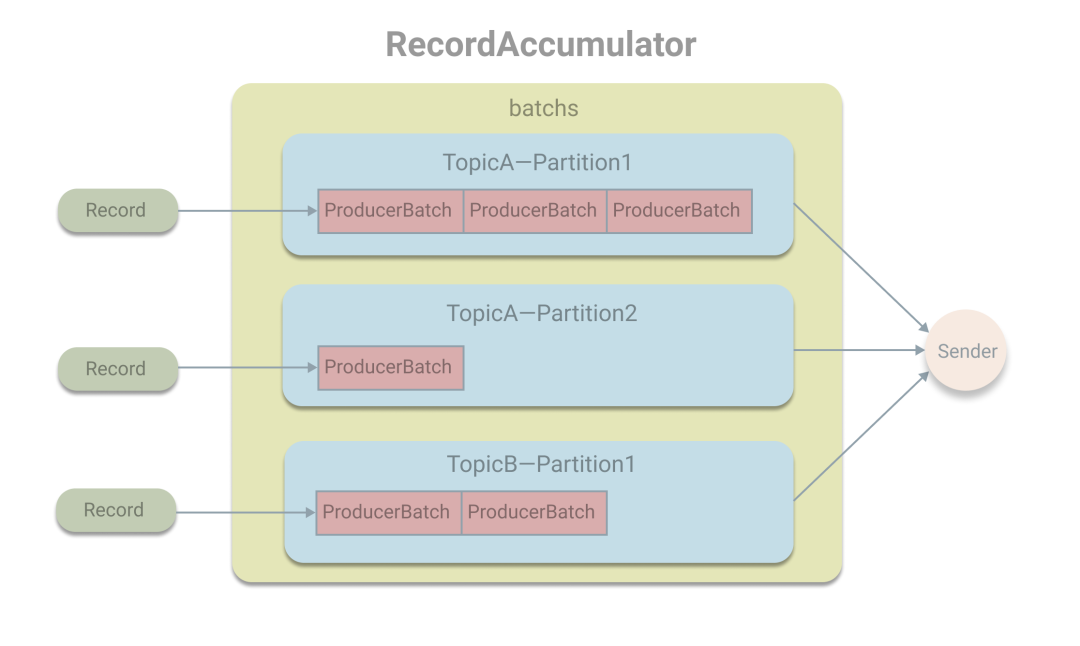 消息累加器,其作用是用于缓存消息,以便批量发送消息。在RecordAccumulator中用一个ConcurrentMap<TopicPartition, Deque<ProducerBatch>> batches的map变量保存消息。作为key的TopicPartition封装了topic和分区号,而对应的value为ProducerBatch的双端队列,也就是将发往同一个分区的消息缓存在ProducerBatch中。在发送消息时,Record会被追加在队列的尾部,即加入到尾部的ProducerBatch中,如果ProducerBatch的空间不足或队列为空,则将创建新的ProducerBatch,然后追加。当ProducerBatch满了或创建新的ProducerBatch时,将唤醒Sender线程从队列的头部获取ProducerBatch进行发送。