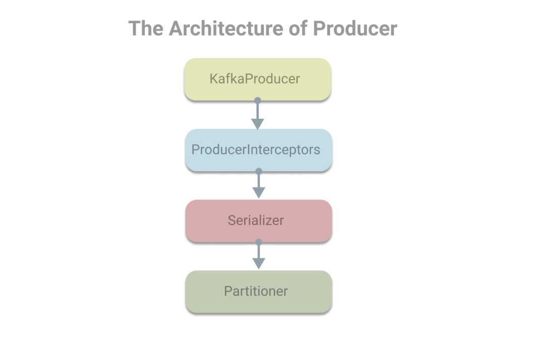 在对生产者对象KafkaProducer和消息对象ProducerRecord有了认识后,下面我们看下在使用生产者发送消息时,会使用到的组件有生产者拦截器、序列化器和分区器。其架构(部分)如下: