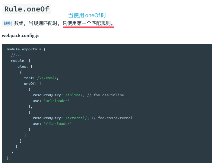 官网上写的很清楚了 就是说如果匹配到的这个文件有 多个loader可用 使用了oneOf后只会命中第一个loader 就结束了 不会再向下继续执行loader 就是图中的url-loader会被命中 file-loader永远不会被命中 这样只命中一个loader就可以减少loader的遍历 从而提升性能 来源:oschina链接:https://my.oschina.net/u/4125329/blog/4918427 标签 Webpack