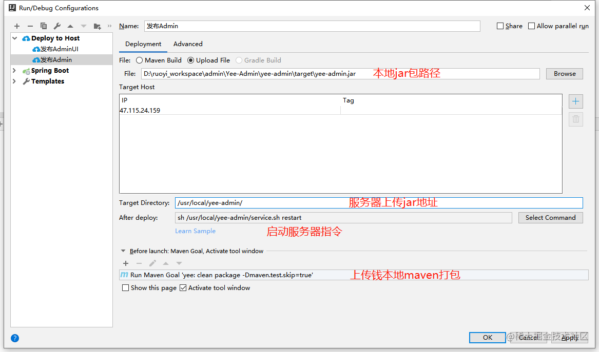 因为服务器上没有安装Maven,我这里利用IDEA打包后,将包上传到服务器指定路径