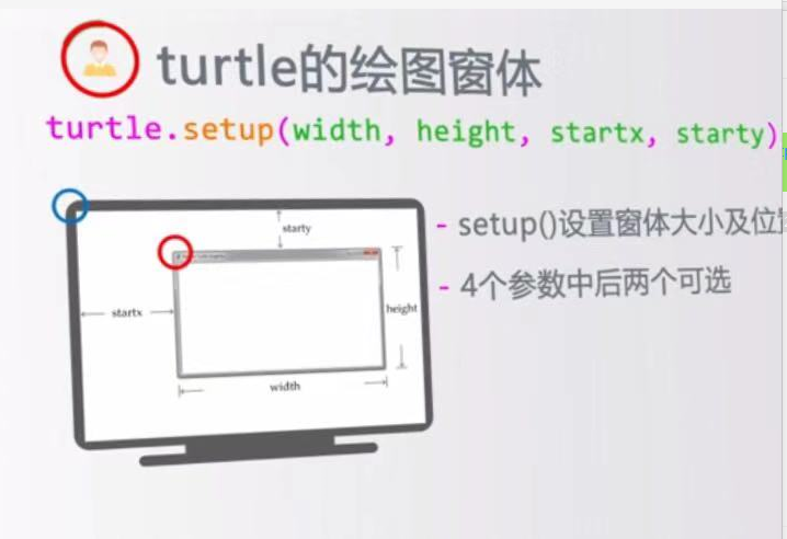 turtle.setup(width,height,startx,starty)---setup不是必须的