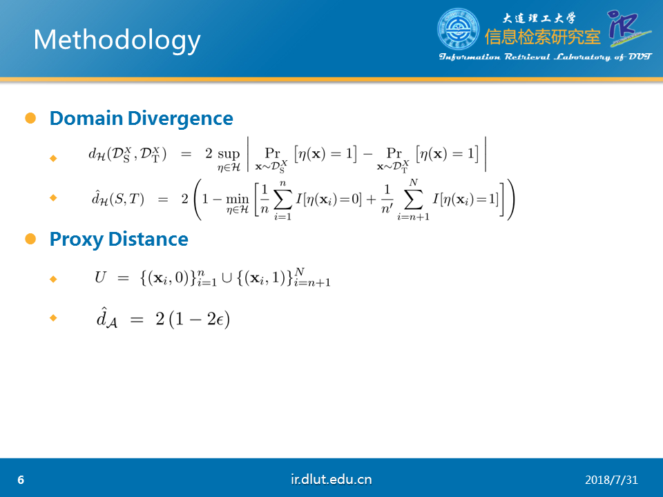 在论文中,作者指出可以使用领域散度(domain divergence)来衡量两个领域的距离。但是由于计算复杂,作者又引入代理距离(Proxy Distance)来计算。即代理距离可以通过分类器在两领域上的误差来衡量(ε表示分类器在两领域上得到的最小损失)。