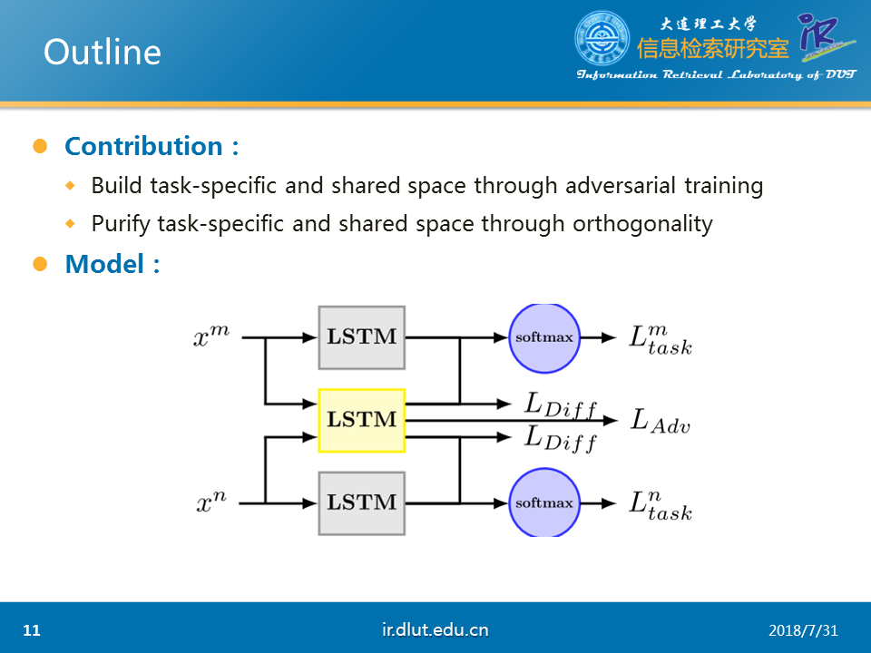 特定任务的损失直接通过softmax来衡量,而对抗训练通过GRL来实现。