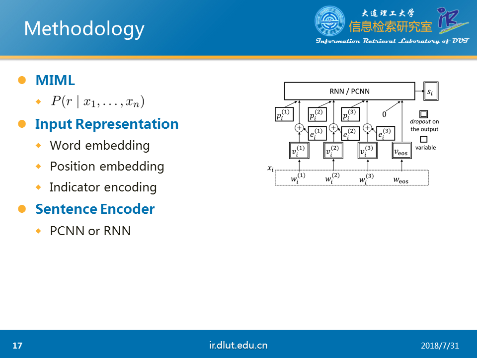 本文的模型首先通过RNN或者PCNN抽取特征,然后通过选择注意力(selective attention)来选择当前实体对最有可能的标签,最后通过softma即可得到模型损失。
