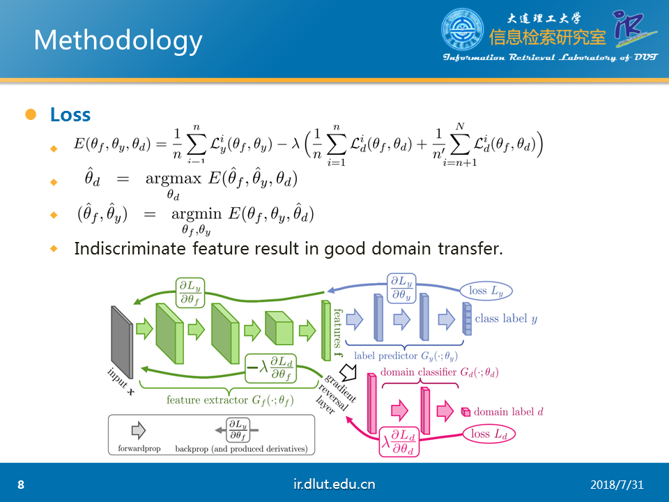 源领域的误差可以通过最小化标签分类器的误差来达到最小化;在领域分类器上,由于代理距离的衡量需要最小化分类器的损失,因此模型需要最小化领域分类器的误差。同时由于要寻找两个领域公共的特征,也就是特征抽取的特征不能最小化领域分类器的误差,必须要最大化。这样与普通的后向传播有很大的区别。为此,作者提出使用GRL来将领域分类器传给特征分类器的梯度进行反向。这样在最小化领域分类器的误差时,从特征抽取器的角度看是最大化领域分类器,而从领域分类器的角度看,是最小化领域分类器的误差,这样就形成了对抗,这就是本文的对抗的体现。