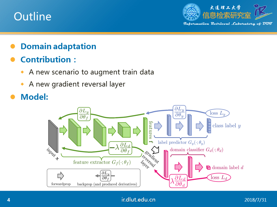 本文的主要贡献是①一种新的扩充训练集的方式②提出了梯度方向层(Gradient Reversal Layer, GRL)