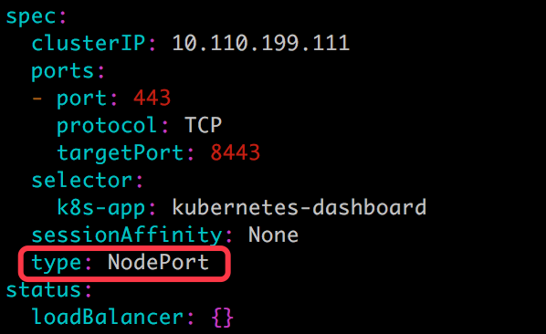 因为 Service 是 ClusterIP 类型,为了方便使用,我们可通过 kubectl --namespace=kube-system edit service kubernetes-dashboard 修改成 NodePort 类型。