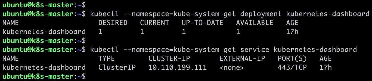 [root@node1 ~]# kubectl get service --namespace=kube-system NAME TYPE CLUSTER-IP EXTERNAL-IP PORT(S) AGE kube-dns ClusterIP 10.96.0.10 <none> 53/UDP,53/TCP 47h kubernetes-dashboard NodePort 10.101.221.220 <none> 443:32240/TCP 17h