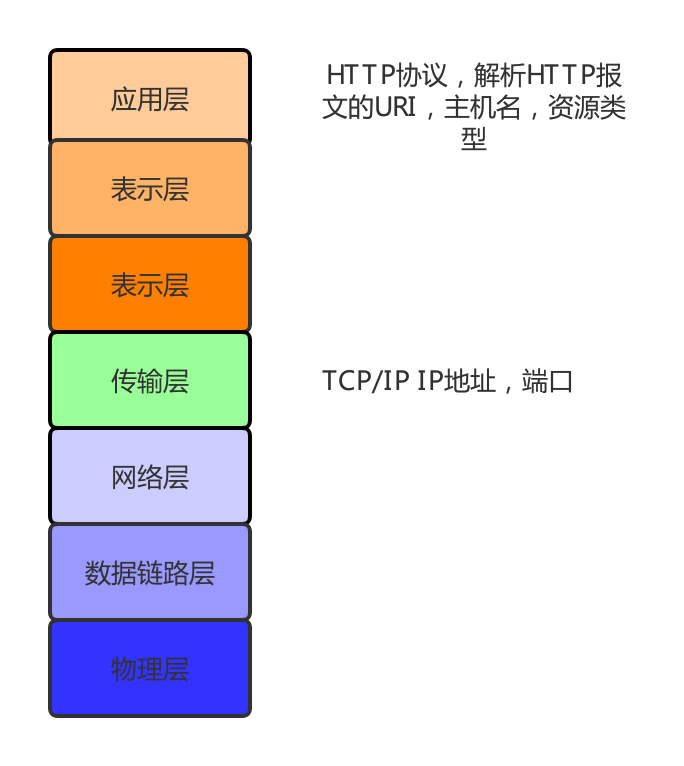 - 七层负载均衡,即工作在第七层应用层,根据HTTP请求头,URL信息转发特定的主机。效率相对低一点。