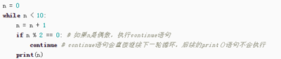 - continue语句,跳过当前的这次循环,直接开始下一次循环