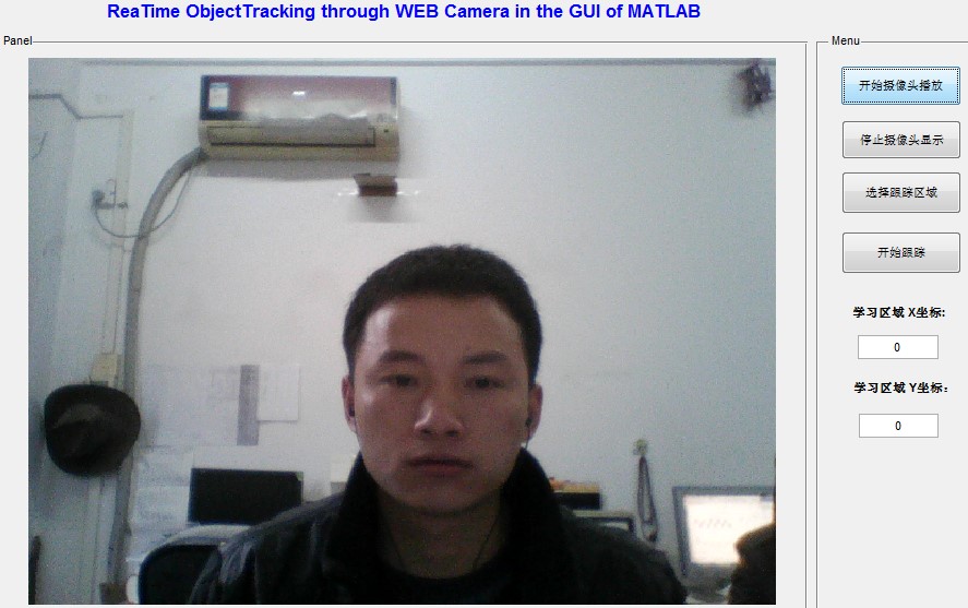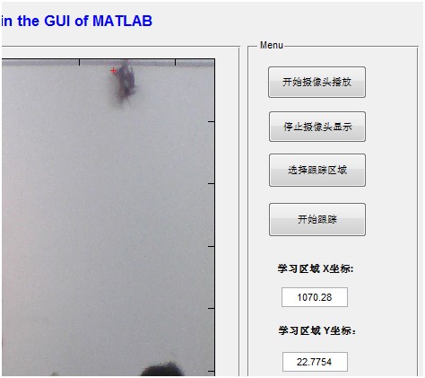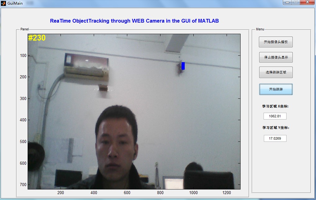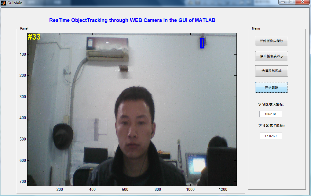 这是本软件算法最重要的部分,最主要的ObjectTracking功能都在此部分实现。本模块通过提供实时的摄像头视频流,并结合目标学习部分的学习区域和回调函数中所使用的跟踪算法来实现对每一帧视频帧的实时跟踪显示。仿真结果表明,在本GUI环境中通过学习之后的区域能够有效的在摄像头实时显示的条件下被跟踪检测到。点击软件界面中的 按钮,即可进入实时跟踪模式,在学习模块中所选择的区域会以一个25*45像素的矩形框显示出来,并且随着摄像头的移动该矩形框能够随之移动从而保持始终对该区域的跟踪。GUI中使用的一个示例如图 所示。