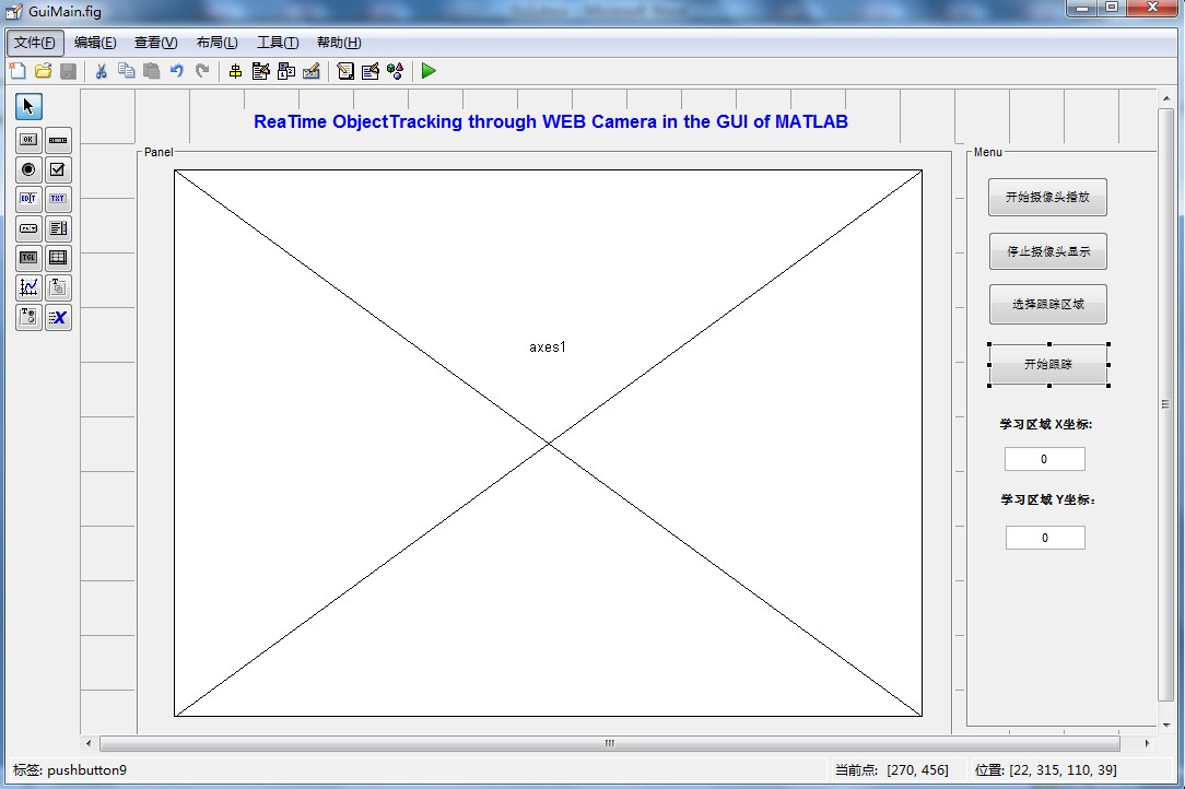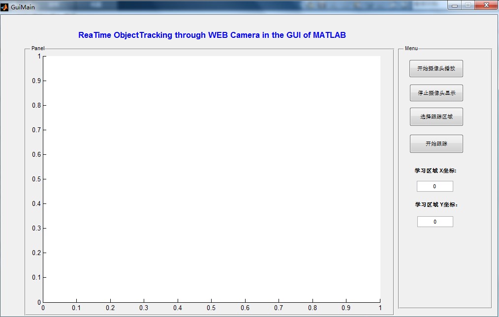 本文使用MATLAB 2014a环境开发基于摄像头的实时目标跟踪软件界面,软件界面主体如图 所示。该软件可以实现的功能主要包括:Camera实时输入及显示、Camera输入暂停并抓取图像帧、用户手动选择跟踪区域、跟踪区域坐标显示及Camera输入实时跟踪等。这些基本功能配合起来可以实现一套完整的、实时的跟踪目标选择à目标区域学习à目标区域跟踪的功能。
