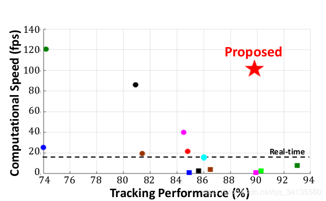 在2018年的CVPR会议上,出现了这样一篇文章:《Context-aware Deep Feature Compression for High-speed Visual Tracking》,引起了不小的反响。主要提出了一种新的基于上下文感知的相关滤波器的跟踪框架,以实现一个实时跟踪器。在计算速度和精度方面都有着不错的成绩。速度提升主要来源于深度特征压缩,利用多个expert auto-encoder的上下文感知方案;上下文是指根据不同层特征图对跟踪目标的粗略分类。在预训练阶段,每个类别训练一个expert auto-encoder。在跟踪阶段,指定一个最佳expert auto-encoder。为了实现高效跟踪性能,引入外部去噪处理和新的正交性损失项orthogonality loss,用于expert auto-encoder的预训练和微调。在保持当前最佳性能的同时,可以达到100fps的速度。