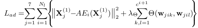当只考虑基本自动编码器的输入和最终输出之间的距离时,经常会出现过拟合和不稳定的训练收敛。为了解决该类问题,设计了一个新的损失函数:这个损失由部分自动编码器的输入和输出的距离组成。部分自动编码器{AEi (X)} Ni=1 仅包含其原始自动编码器AE(X)的一部分编码和解码层,而输入和输出大小与原始自动编码器的大小一样,i.e. AE 1 (X) = g 1 (f 1 (X)),AE 2 (X) = g 1 (g 2 (f 2 (f 1 (X)))), · · · when AE(X) =g 1 (· · · (g N l (f N l (· · · (f 1 (X)))))).因此,基于多级距离的损失可以描述为