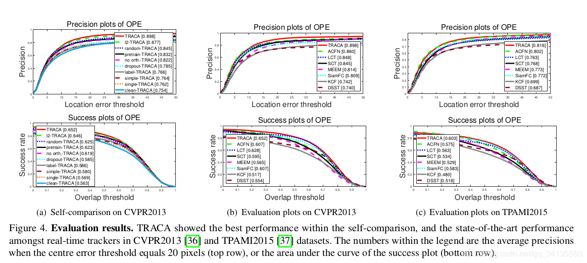 作为性能测量,我们使用单程评估(OPE)的平均精度曲线。通过平均所有序列的精确度曲线来估计平均精确度曲线,其使用两个来源获得:位置误差阈值和重叠阈值。作为跟踪器的代表性分数,使用当位置误差阈值等于20个像素时的平均精度和成功曲线的曲线下面积。