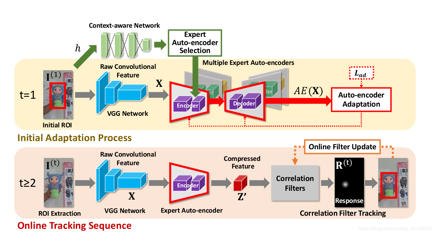 图2提出的算法方案。 专家自动编码器由上下文感知网络选择,并由初始帧(I(1))处的ROI部分微调一次。对于以下帧,我们首先提取以前一目标位置为中心的ROI patch(I(t))。然后,通过VGG-Net获得原始深度卷积特征(X),并由微调专家自动编码器压缩。压缩特征(Z 0)用作相关滤波器的特征图,目标的位置由滤波器响应的峰值位置确定。在每帧之后,通过新发现的目标的压缩特征在线更新相关滤波器。