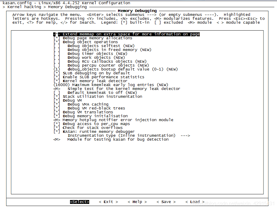依次选择Kernel hacking > Memory Debugging,然后配置内存debug选项,这里我把大部分debug选项都选中了: