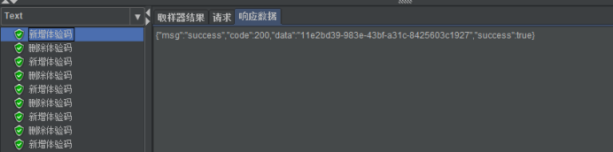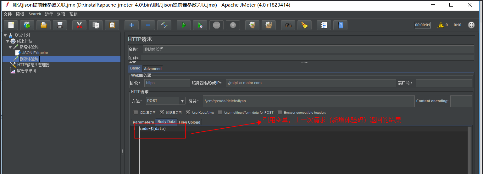 2、 在新增体验码中的json提取器定义一个变量,提取返回结果。然后在下一个请求(删除体验码)中引用这个变量