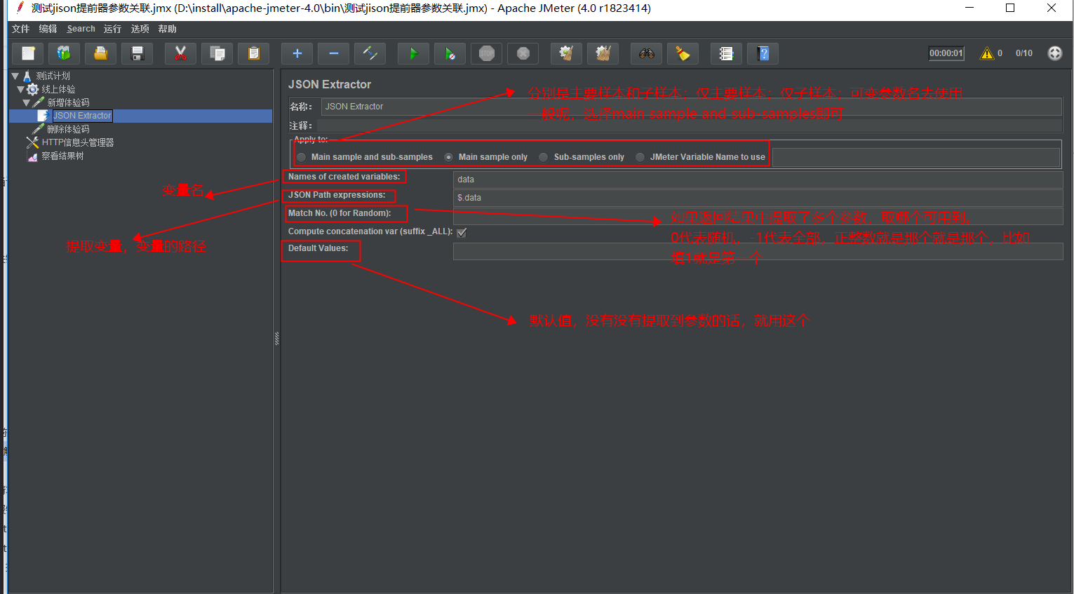 添加方法为:xx请求-后置处理器-json extractor