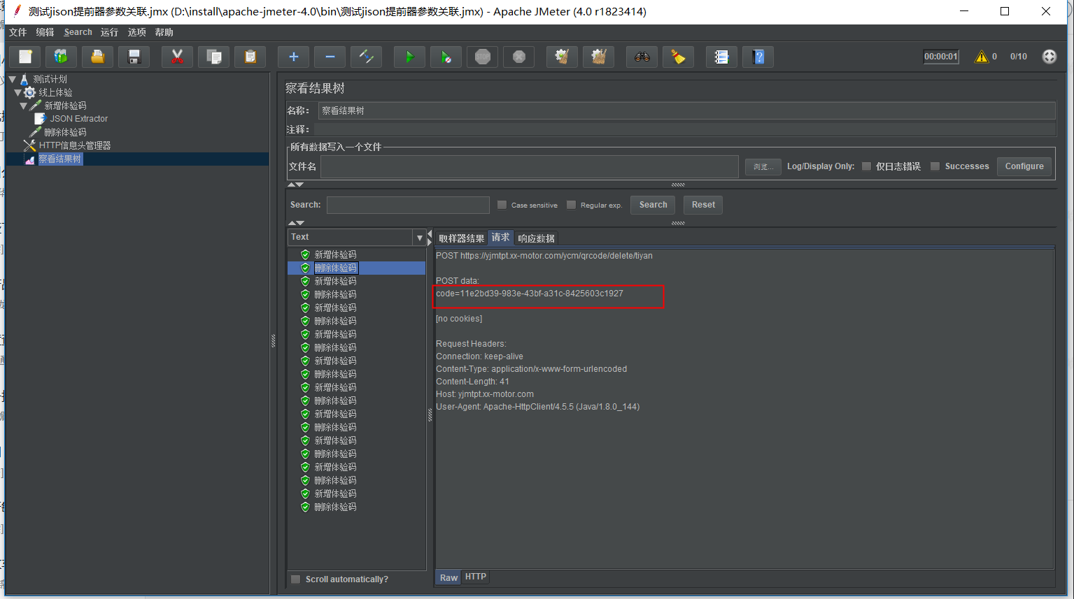 3、下一个请求(删除体验码)中,引用这个变量信息