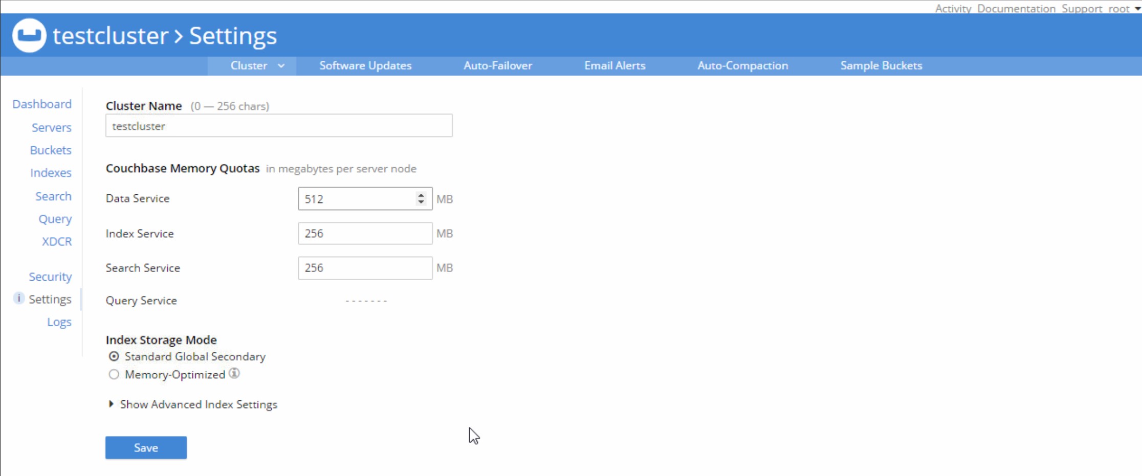Settings:CouchBase系统配置相关,例如配额,自动压缩,自动容错,告警之类的