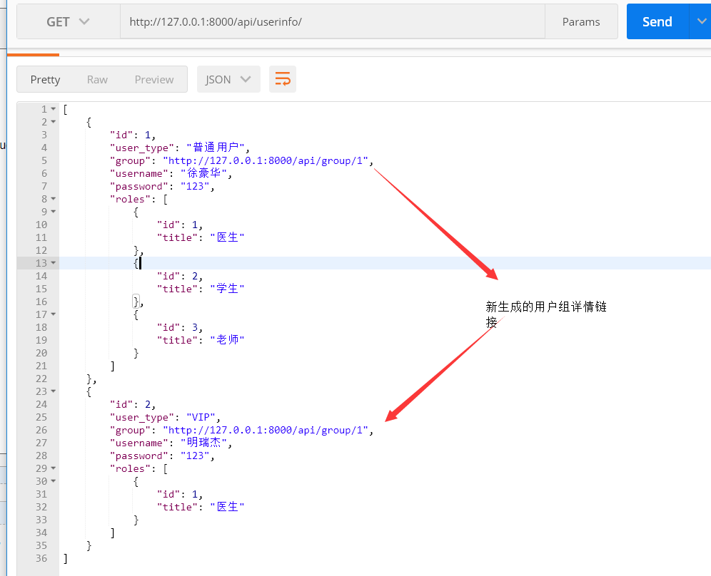 在上面我们看到,在返回组group的时候是返回该组的<code>id</code>,或者用<code>depth</code>深度控制,返回组的详细信息。在restful规范中,规定应该给出相应的详情链接,可以通过url拼接,在django rest framework中也有相对应的实现。 首先改写一下用户信息序列化类,使之能够提供用户组详情的有关url