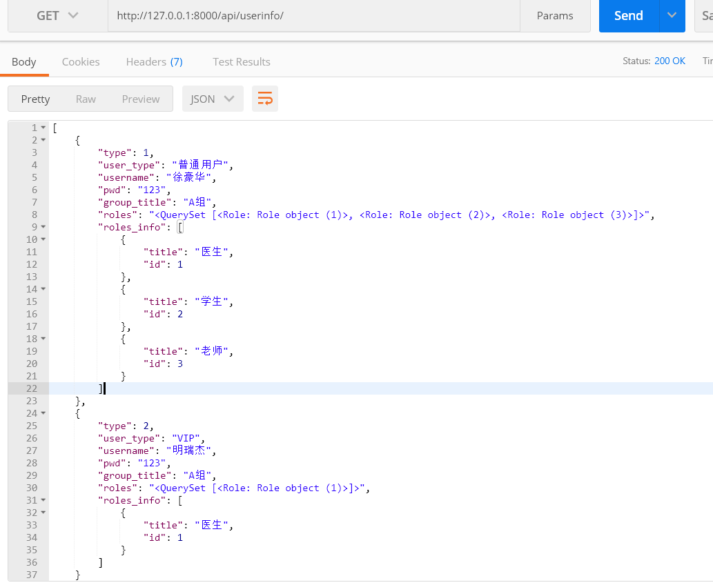 - 对于roles字段,想直接获取所有的对象,但是无法做到细粒度的将对象的所有属性展示出来,只能获取到<code>QuerySet</code>对象