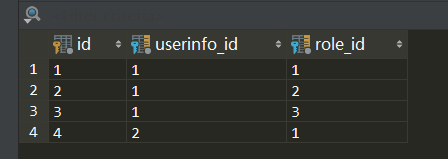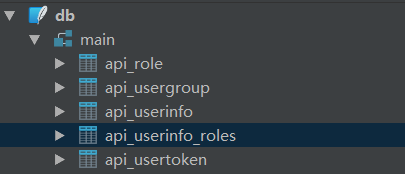 多对多关系的时候,<code>django</code>自动生成第三张表维系表关系,字段分别是<code>userinfo</code>和<code>role</code>的<code>id</code>,其中<code>api_userinfo_roles</code>为多对多关系生成的表。 在表中添加少量数据
