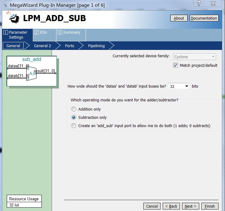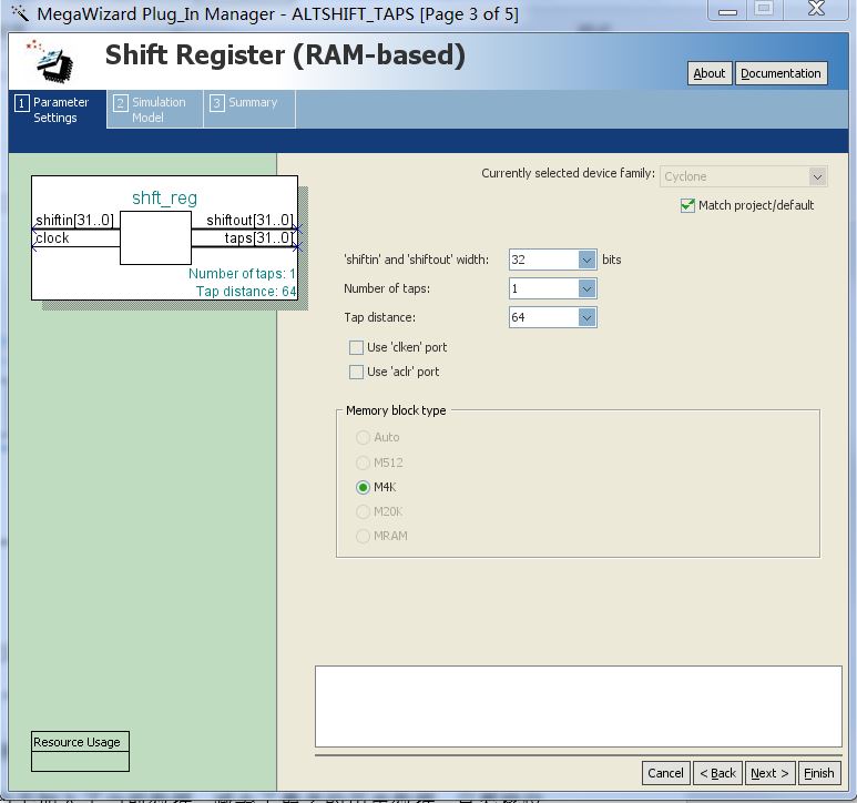求差(补码),再对差不断求和。这样根据加法交换律,最终求和结果就相当于加入了当前数据,减去了最老的历史数据。只要移位寄存器的初值全为0,在进行了64次操作后,从输出得到的就是64个历史数据的和(积分)了。其中用MegaWizard配置的移位寄存器结构如下图所示。