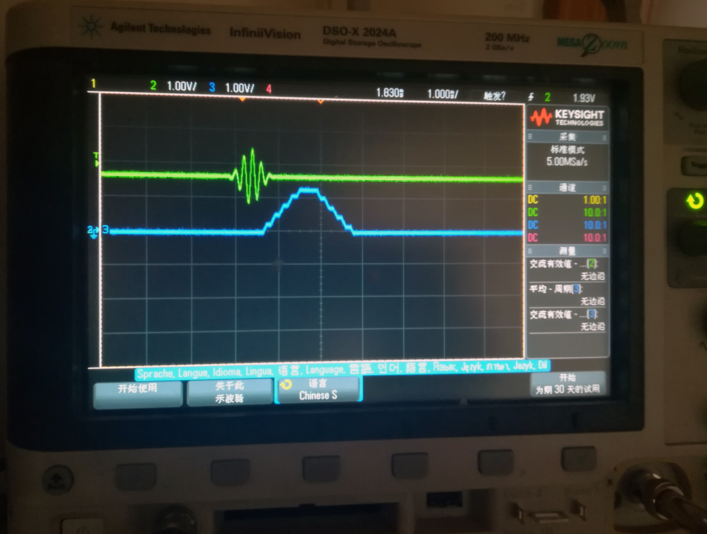 我将该信号下载到是德科技任意信号发生器33521中,用手动触发方式让33521产生上图所示的波形,以模拟理论回波信号。将其连接到FPGA平台的A/D输入端,将处理结果从FPGA平台的D/A输出。用示波器观测输入和处理结果如下图所示。