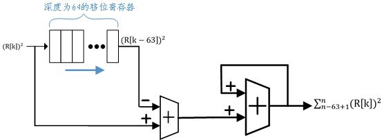 根据(2)式,要计算目标函数P[n]的值,还需要对历史上的 值求和(积分)。我们当然可以用缓冲器存储历史上的k0个 值,并在每次结果输出之前对缓冲器中的k0个值求和。如果让k0等于激励信号的长度N,则每次输出P[n]之前都需要计算N-1个加法。当N为64时(如前文所述),这几乎是不可完成的任务。我设计了下图所示的电路结构来实现64个历史数据的求和。