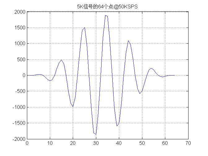 用matlab产生6正弦周期,长度为60个采样点的信号,在前后各补2个0,从而得到长度为64个采样点的正弦信号。之所以采用60个采样点包含6个正弦周期,是为了模拟5KHz的正弦信号@50KSPS的采样率。最后再为64个采样点加上blackman窗以降低泄露的影响。