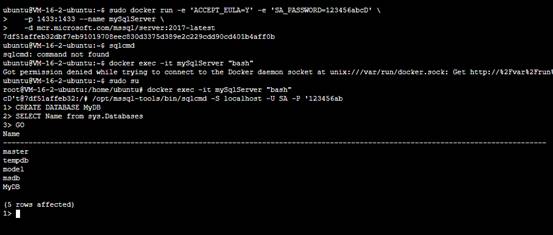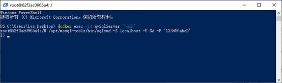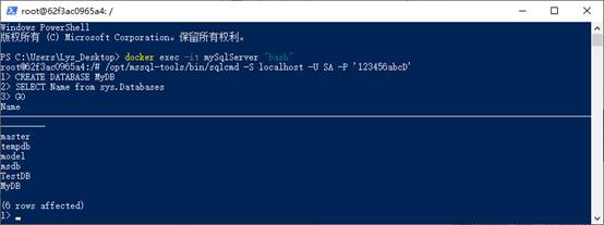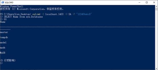 除了以上方式,我们也可以在容器外使用sqlcmd连接数据库: