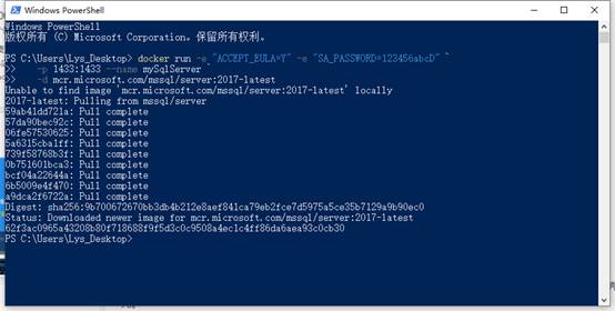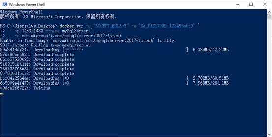 执行之后(镜像不存在会自动拉取,大家也可以使用拉取命令下拉取镜像,比如:docker pull mcr.microsoft.com/mssql/server:2017-latest),会默认创建一个使用 SQL Server 2017 开发人员版的容器,端口为1433,密码为123456abcD。