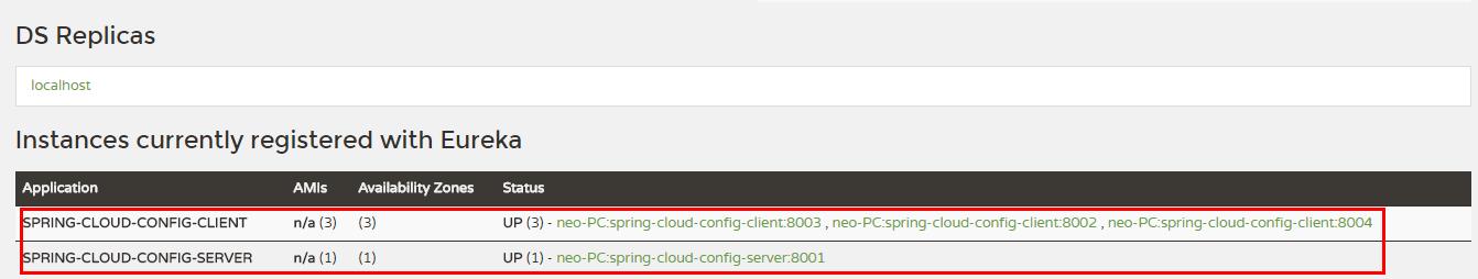 说明客户端已经具备了消息总线通知的能力了,为了更好的模拟消息总线的效果,我们更改客户端spring-cloud-config-client项目的端口为8003、8004依次启动,这样测试环境就准备好了。启动后eureka后台效果图如下: