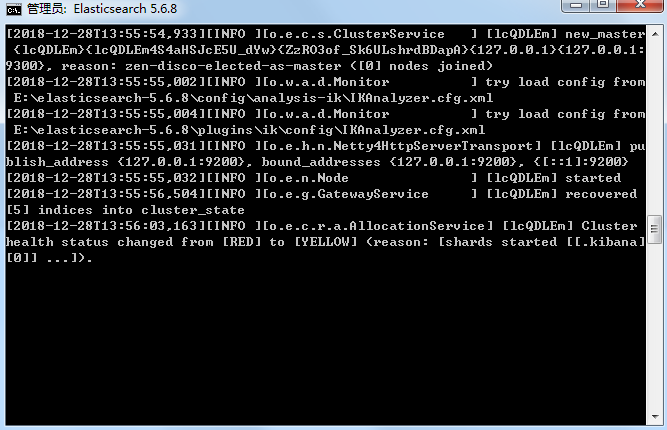 第一步:运行elasticsearch.bat文件,打开elasticsearch,运行成功可以看到: