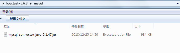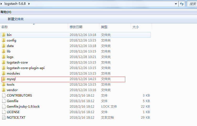 第一步:在logstash-5.6.8文件下创建一个空文件夹,文件夹名字可以随意取,这个文件夹主要用来放mysql的相关配置文件,我这里创建了一个mysql文件夹: