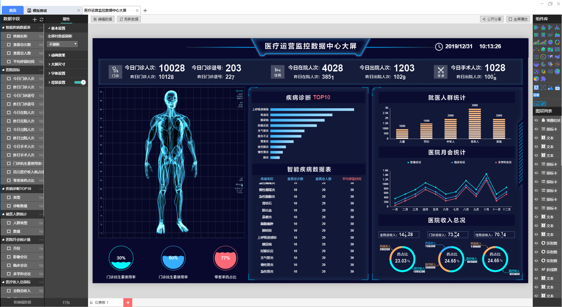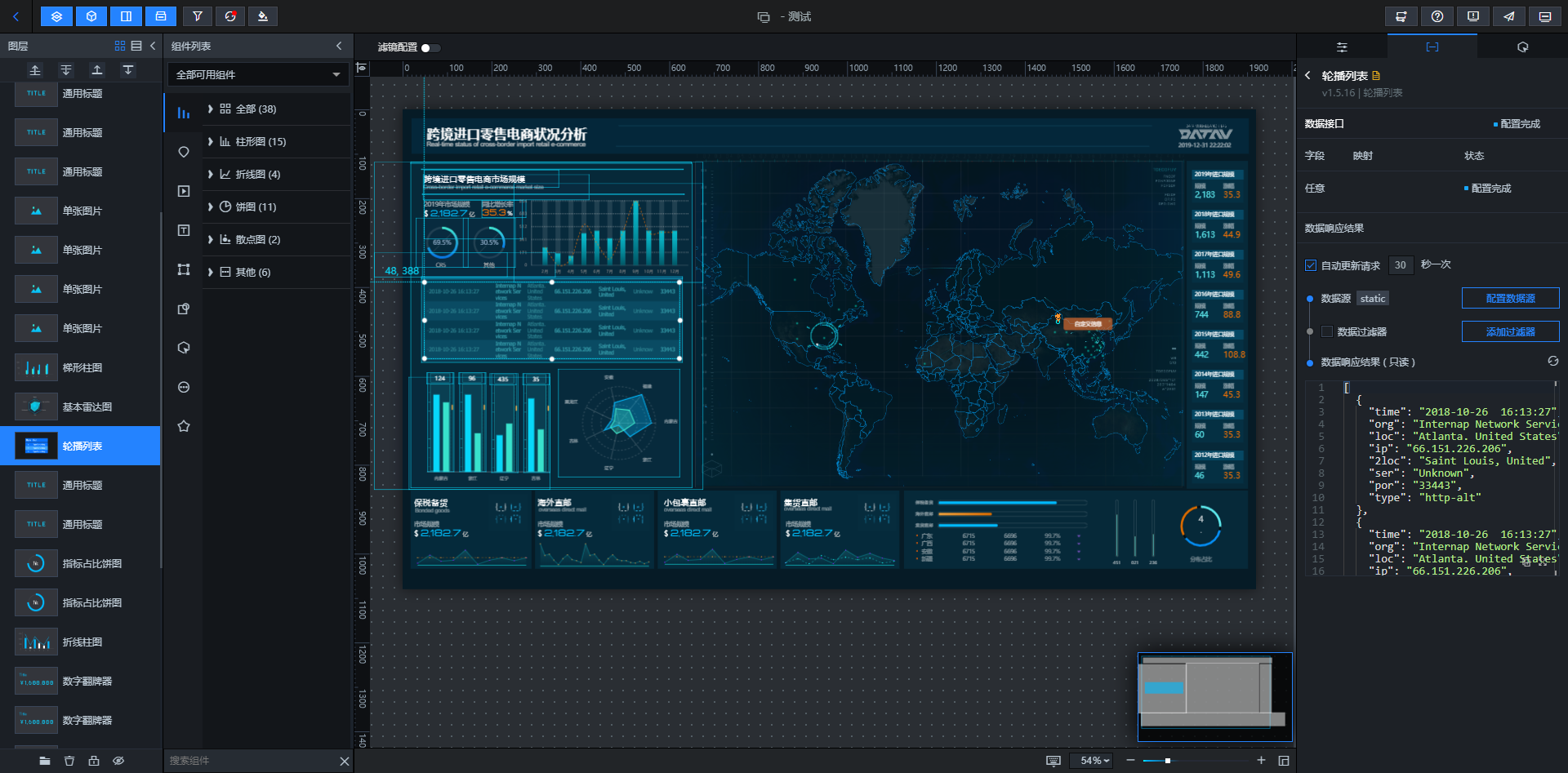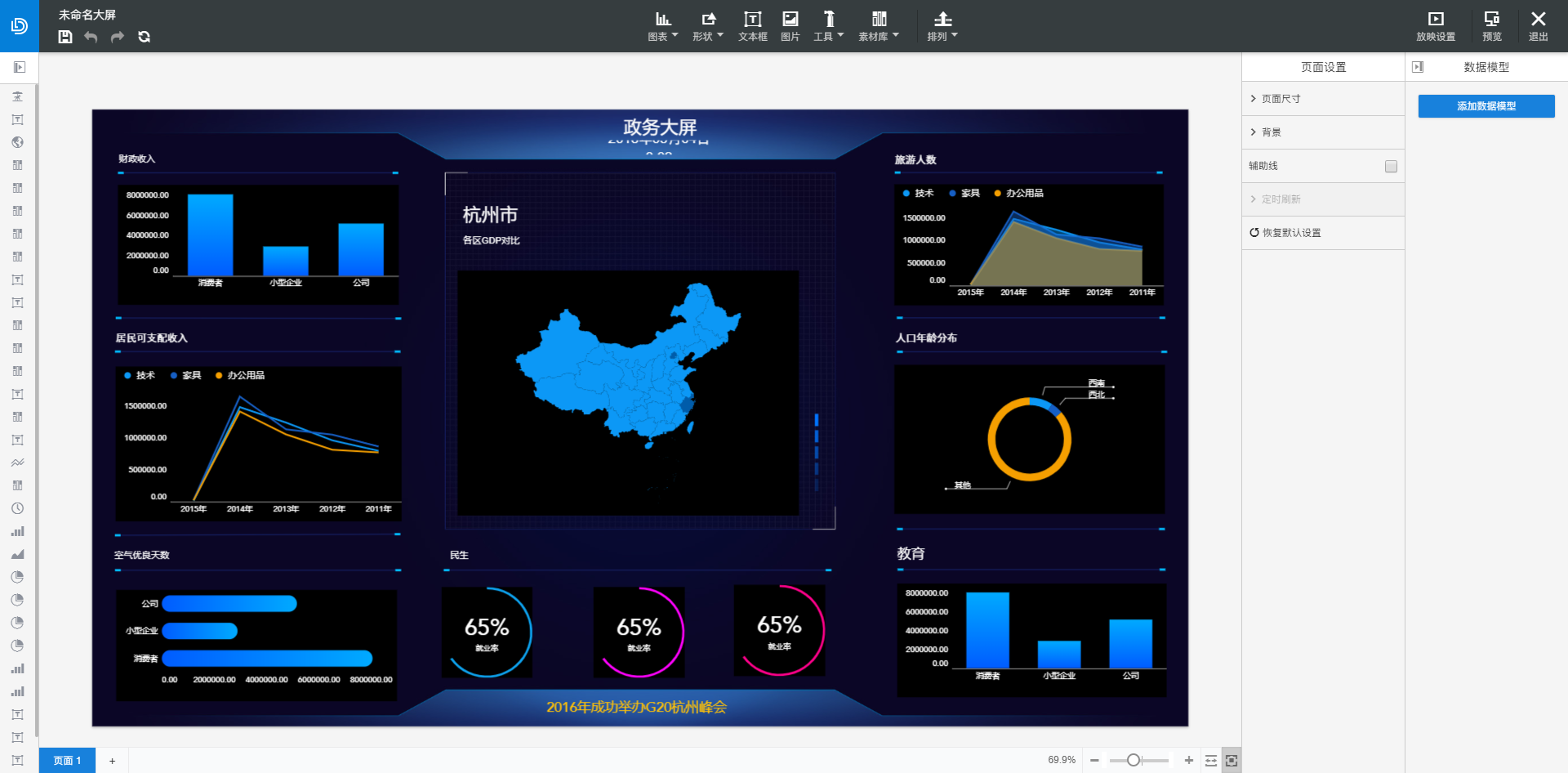 (2)支持丰富的大屏组件和自定义组件,可以创建各种样式的大屏