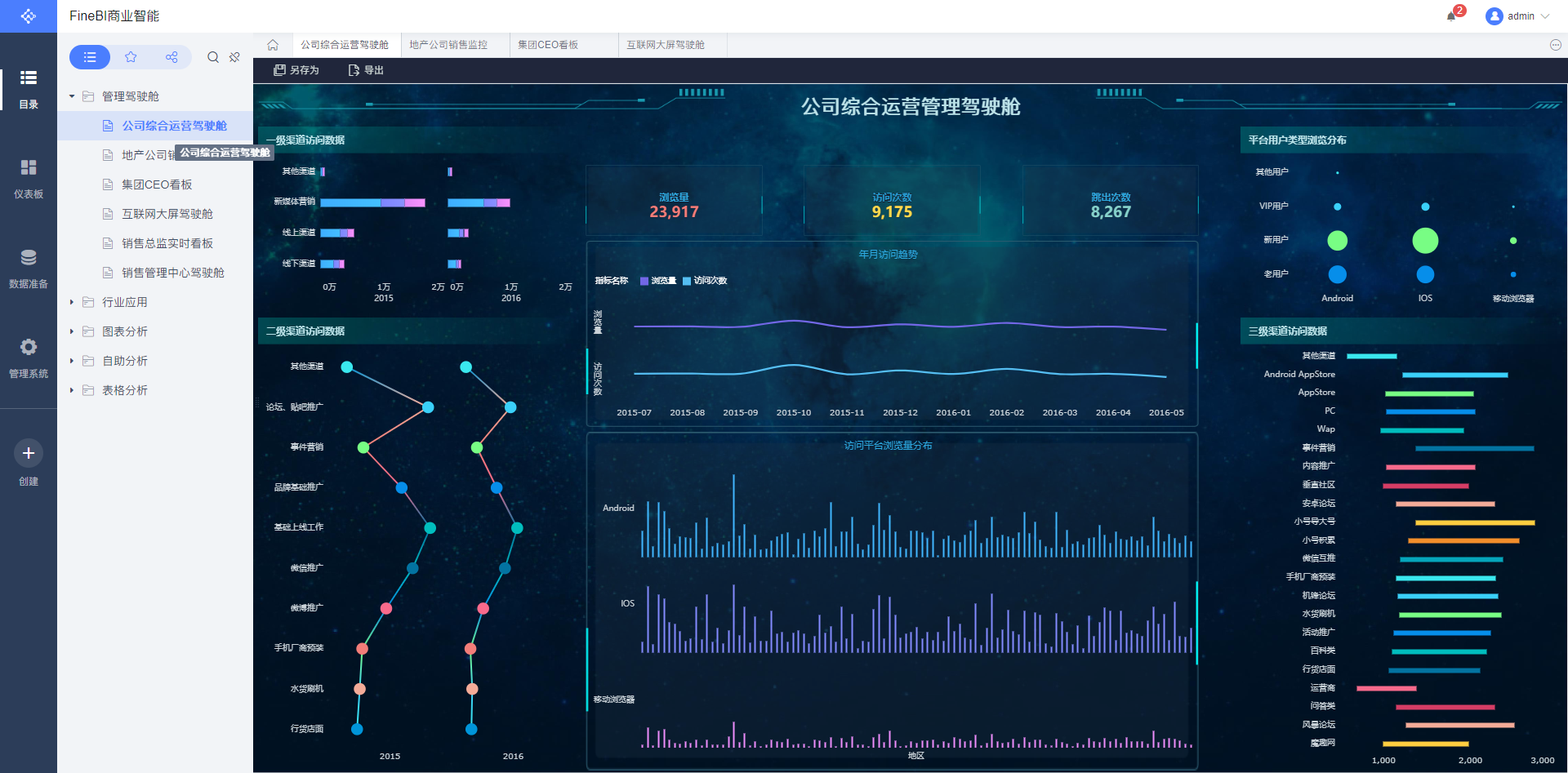 还有一些BI软件也可以用来制作大屏,类似有PowerBI和Tableau,这些都是交互式BI软件,更多的是偏向于报表处理和数据分析,利用这些软件也能做出一些样式的可视化大屏,但是毕竟他们的重点功能不在于可视化大屏的编辑,因此没有做针对性的用户体验优化,大屏的相关功能淹没在丰富的报表功能中,用户很难上手。