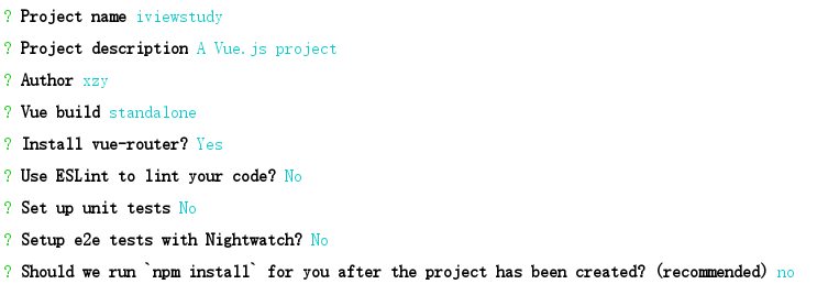 脚手架安装成功后,输入 vue init webpack iviewstudy(iviewstudy为包名)