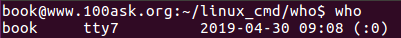 第一个参数book代表用户名,第二个参数tty7代表终端名,第三个参数代表时间,第四个参数代表用户的登录地址。