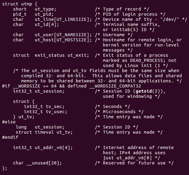 我们查询到一些关于utmp结构体中的元素,比如ut_user用户名字、ut_line用户设备、ut_time登录时间等。