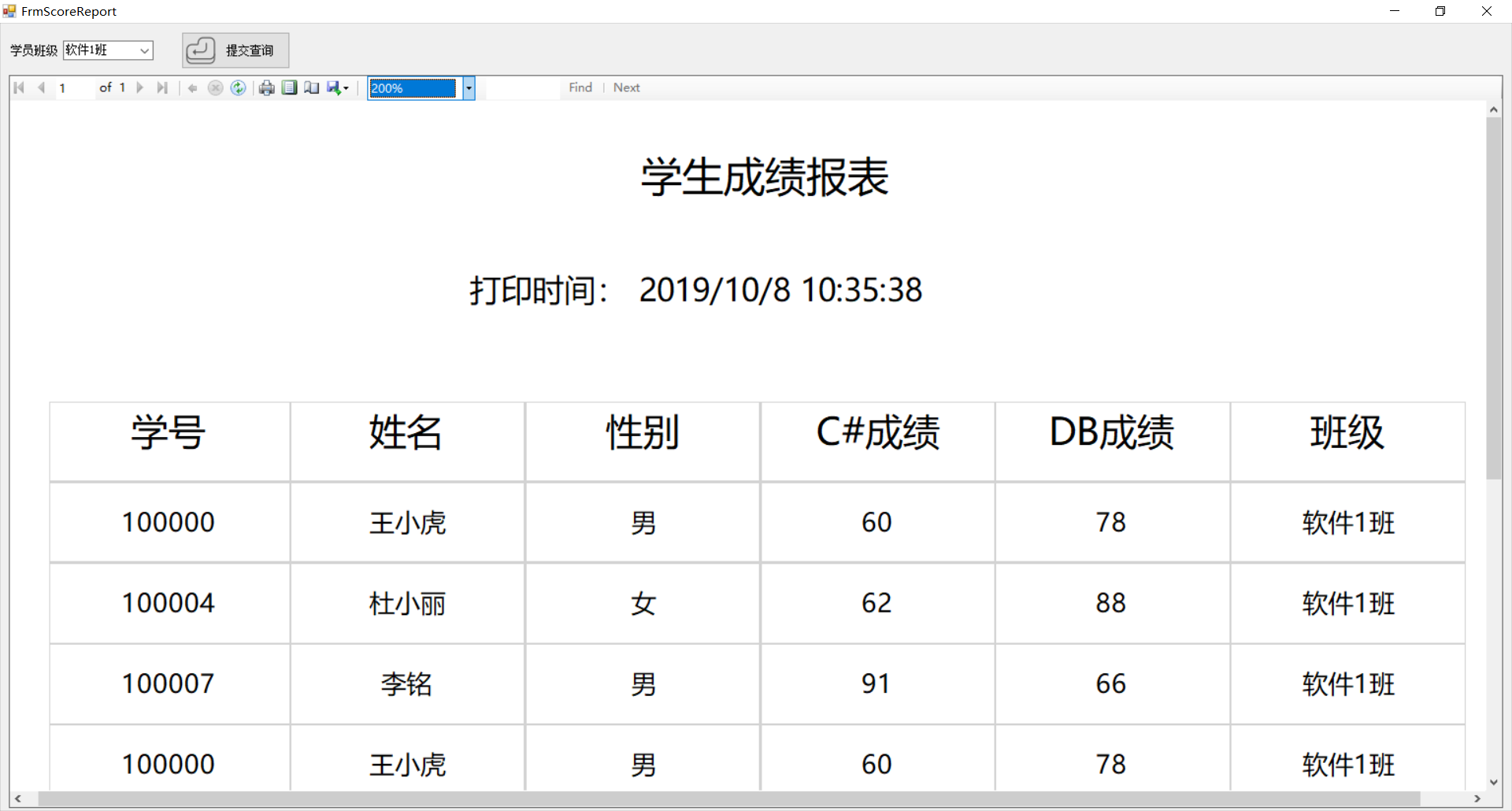 this.reportViewer1.LocalReport.ReportEmbeddedResource = "StudentManagerPro.RDLC.ScoreReport.rdlc";其他步骤都是和之前一样,运行看结果: